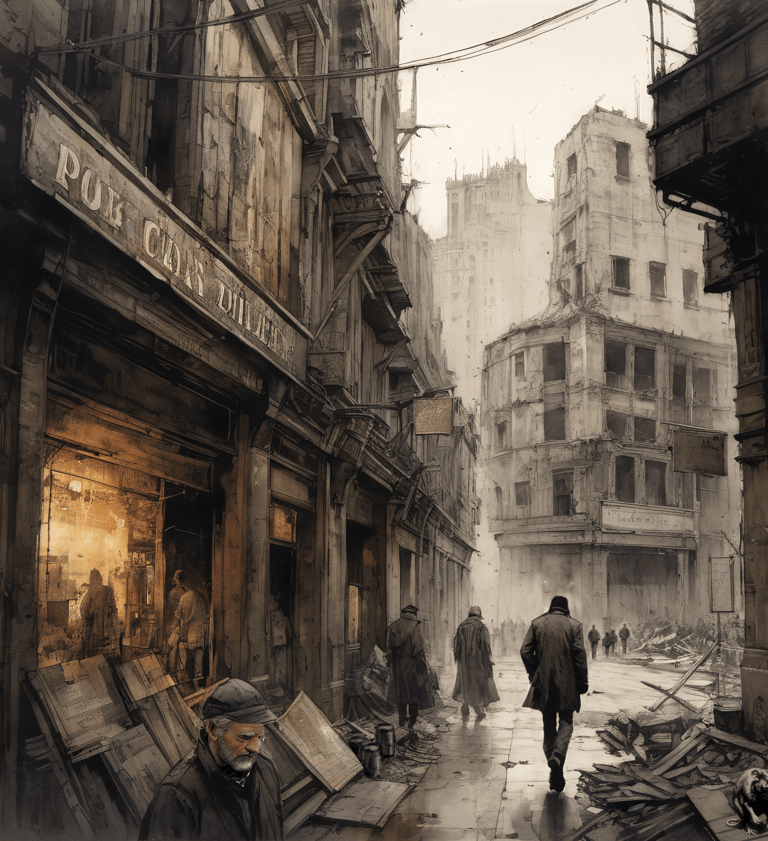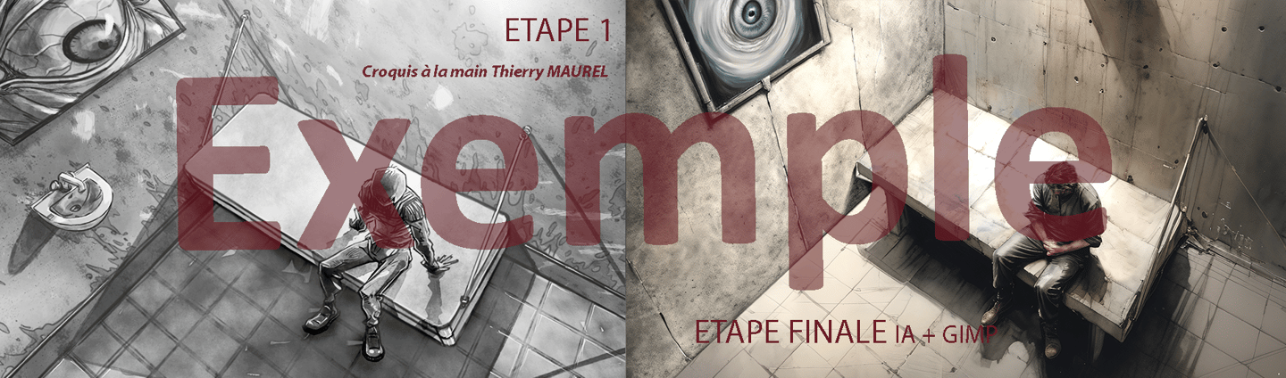 Pour faire simple, voici les étapes : Dessin à la main -> croquis au fusain – génération IA à partir du croquis (en limitant la créativité de l'IA à un pourcentage bas) -> grosses corrections des défauts générés (hallucinations) + assemblage des différentes versions et étalonnage avec Gimp ou Photoshop.